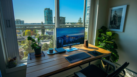 Well-organized home office setup with a scenic view through large windows, featuring a sleek desk and computer