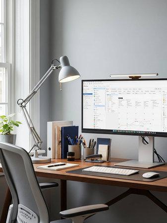 Bright, cozy home office with a wooden desk, ergonomic chair, and ambient lighting. Task lighting over the desk allows for