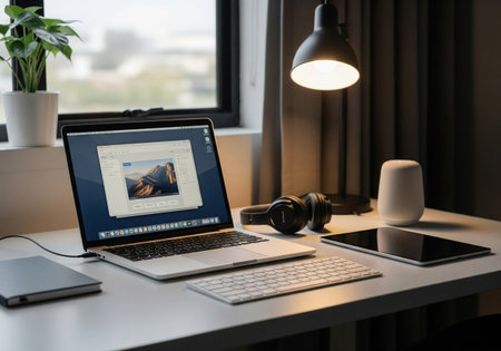 Clean and Minimalist Home Office Workspace with Laptop, Tablet, and Potted Plant