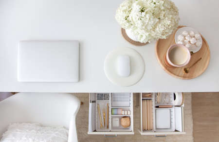 The gold stationery is neatly arranged in white containers in the drawers of the nightstand. Storage and tidying up the workplace.