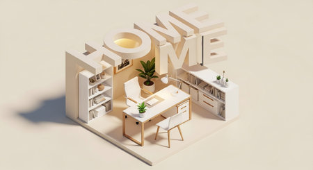 An isometric view of a modern home office interior, featuring multiple white desks equipped with computers and ergonomic chairs. The space is organized with built-in bookshelves filled with books and decorative a potted plant adding a touch of greenery, and a desk lamp providing illumination. The word HOME is prominently displayed in large wooden letters, emphasizing the concept of working from home. The overall aesthetic is clean, minimalist, and rendered in neutral tones of beige and...