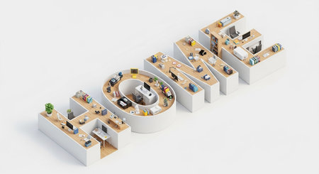 An isometric 3D visualizes the word HOME as a combined living room and home office. The includes a comfortable living area with a sofa, coffee table, and decorative on the wall. A separate workspace a desk, computer, chair, and bookshelves filled with books and plants. Natural light enters through windows, illuminating the warm wooden floors and white interior This concept showcases a harmonious blend of relaxation and productivity within a domestic environment, emphasizing functional and...