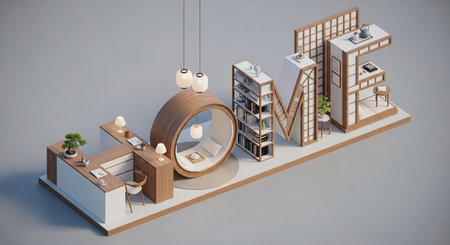 This isometric creatively spells out the word HOME using distinct interior vignettes. Each letter is transformed into a miniature living space, showcasing like a modern desk with a computer, a cozy reading nook within a circular structure, a minimalist bookshelf filled with books and decorative and a serene Japanese-inspired room with tatami mats and a tea set. The color palette is dominated by warm wood tones and clean whites, creating a sense of calm and living.