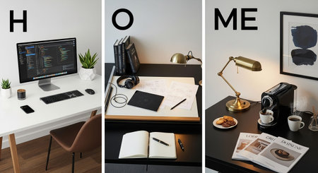 A triptych showcasing a modern home office setup. The left panel a white desk with a computer, keyboard, mouse, and a small potted plant. The middle panel a black desk with books, headphones, a notebook, and papers. The right panel a desk with a brass lamp, a coffee machine, a cup of coffee, cookies, and a framed abstract on the wall. The overall aesthetic is clean, organized, and conducive to productivity.