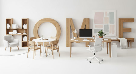 This isometric 3D presents the word HOME as a miniature, fully furnished home office. The letters are transformed into architectural housing a desk, ergonomic chair, shelving units filled with books and decor, a potted plant, and a desk lamp. The scene is bathed in soft, natural light, emphasizing a clean, modern, and minimalist with a harmonious blend of white and light wood. It conveys a sense of a well-organized and comfortable personal workspace.