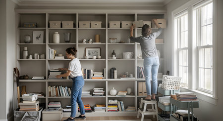 Two women are actively organizing a large, floor-to-ceiling shelving unit in a bright living room. One stands on a step stool reaching for a box on the top shelf, while the other arranges books on a lower shelf. The room is filled with books, storage boxes, and decor items being sorted and tidied.