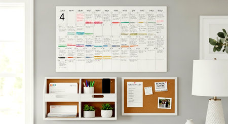 a well organized wall with a calendar, mail organizer, cork board, and lamp in a bright and clean home office This image features a transparent background, making it versatile for various design projects.