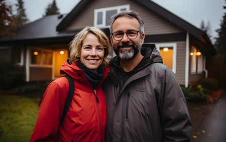 Smiling couple standing in front of their new home, symbolizing happiness and achievement in homeownership. High quality photo