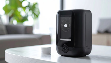 A clean arrangement of minimalist white and grey smart home devices, including a smart thermostat, a cylindrical smart speaker, and a spherical device, set on a pristine white surface, reflecting modern and user-friendly home automation technology.