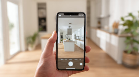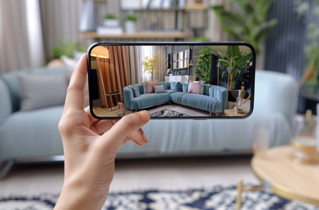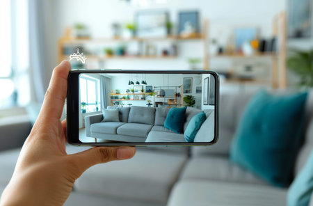 Hand holding smart phone, AR application, simulate furniture and interior design products in real home, architect designer concept, blur background, japandi bedroom