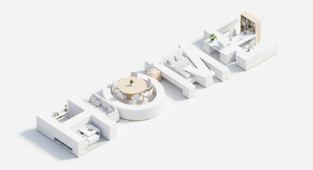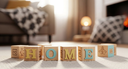 Colourful text of HOME placed on grid lines paper with wooden home background.