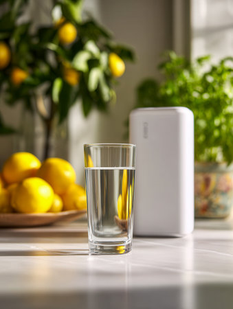 Sunlight highlights a pristine glass of cool water placed on a kitchen surface, surrounded by vibrant lemons and lush greenery that evokes a fresh, wholesome atmosphere
