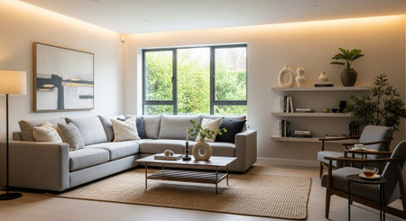 Luxury living room interior with white sofa and wooden coffee table. Nobody inside