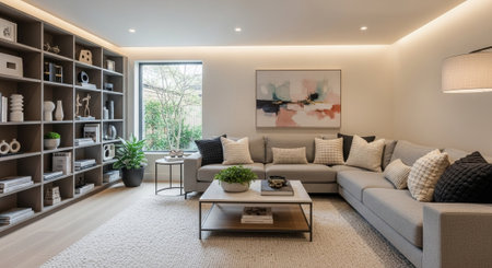 Living room interior with sofa, coffee table and bookshelves. Northwest, USA