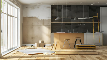 A bright and inviting kitchen renovation space showcasing an open layout bathed in natural light, with a mix of construction materials and tools.