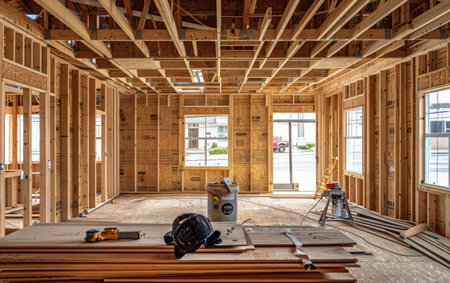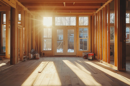 Bright cinematic scene of an under construction house with sunlight and scattered materials