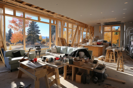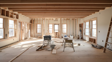 A modern renovation scene showcasing an unfinished spacious interior with wood paneling and tools ready for carpentry work, reflecting a contemporary design.