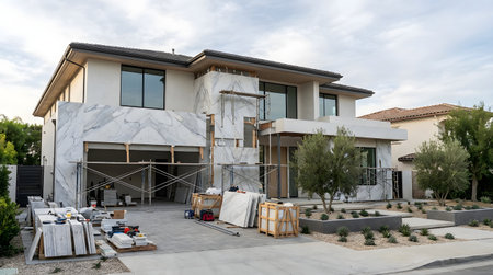 A modern house under construction showcases a striking marble exterior and scaffolding. The image captures the renovation process with tools and materials around, emphasizing architectural progress.