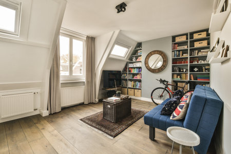 Cozy living room interior with sofa, coffee table, bookshelf, books and window