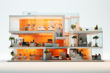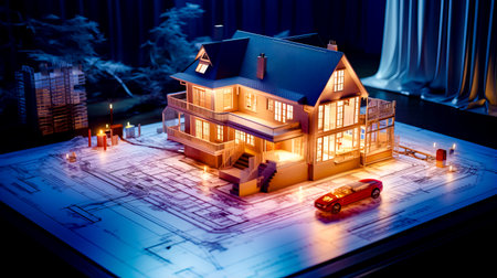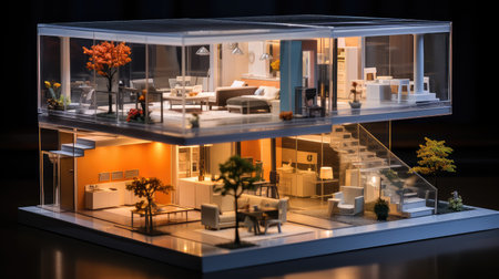 An architectural model of a modern house exhibits a layered design with integrated greenery. The composition features rectangular structures, warm interior lighting, and transparent walls. The model sits on a table, with a blurred background hinting at an indoor setting. This image is suitable for various commercial uses, including illustrations of design and construction.