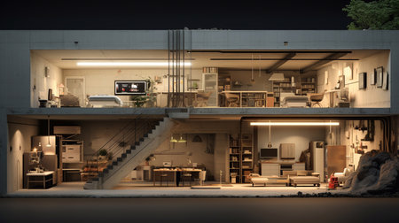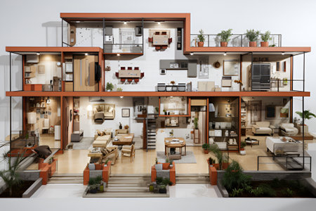 A beautifully detailed cross-section of a modern house showcasing innovative interior design elements in various living spaces filled with natural light.