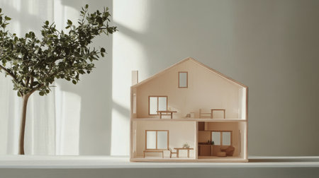 A small wooden house model displays a cozy interior with a bed and furniture. Bright natural light filters through sheer curtains, highlighting the peaceful ambiance alongside a small artificial tree.