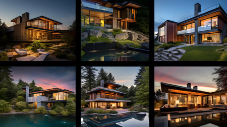 Home architecture design in Mid-Century Style with Angular rooflines constructed by Wood and Glass material. Atomic Ranch style. Generative AI AIG25 .