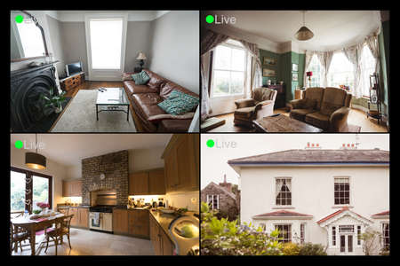 Composition of four security camera screens with live text, house and house interiors. security, safety, surveillance, and digital interface.