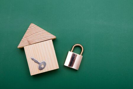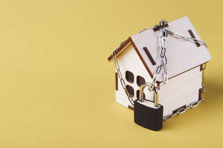 housing arrest. castle house. Small toy house and a chain with a lock. Eviction for non-payment. The locked door to the house.