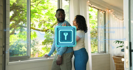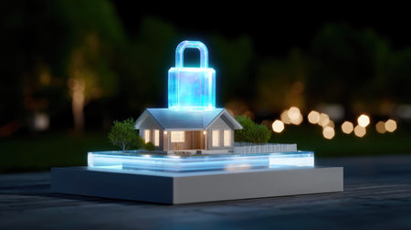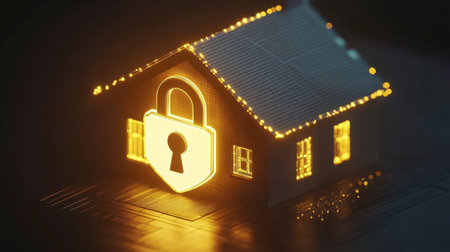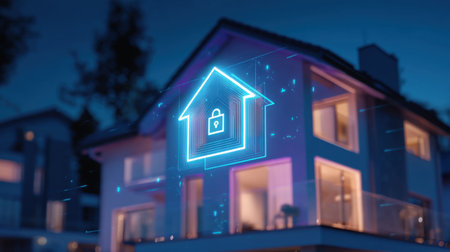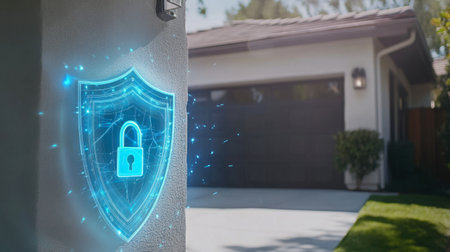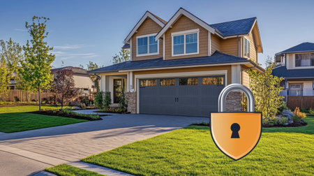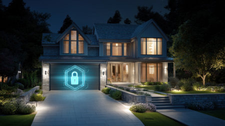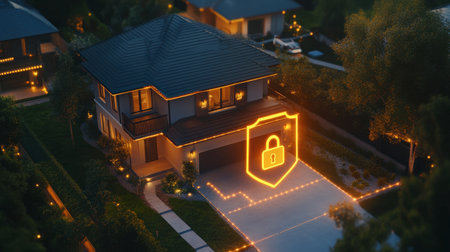 This image depicts a modern home security concept, featuring a digital lock icon on a shield outside a residential property, symbolizing advanced protection and safety measures.