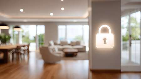 A modern interior showcasing a cozy living space with a glowing lock icon on the wall, symbolizing security and privacy in a stylish design.