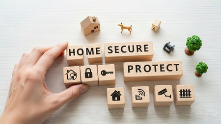 A collection of wooden blocks spelling out HOME SECURE PROTECT are displayed alongside miniature models. The composition features neutral tones with well-lit objects. The scene suggests a concept related to security. Suitable for commercial projects.