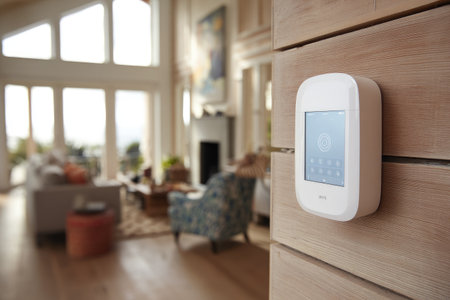 A close-up view presents a modern, white security system panel mounted on a wooden wall. The background shows a blurred interior setting with furniture and large windows, suggesting a spacious living area. The lighting appears soft and natural, suitable for commercial applications such as advertising or editorial content.