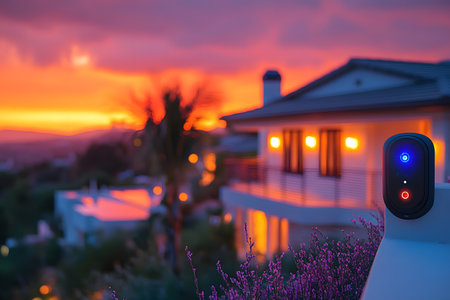 A smart security camera monitors a contemporary home at sunset, advanced surveillance technology. the vibrant sunset and modern architecture create a blend of security and aesthetics. Generative AI