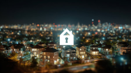 A captivating nighttime cityscape showcases illuminated homes, embodying security and safety with a prominent lock symbol, reflecting urban lifestyle and community.