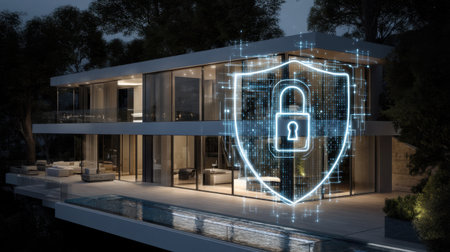 A modern home featuring a digital security shield with a glowing padlock symbol overlays, illustrating advanced technology in residential safety and design.