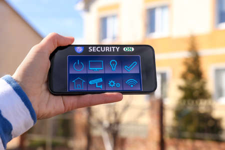 smarthouse home automation device with app icons. Man uses his smartphone with smart home security app to unlock the door of his house.