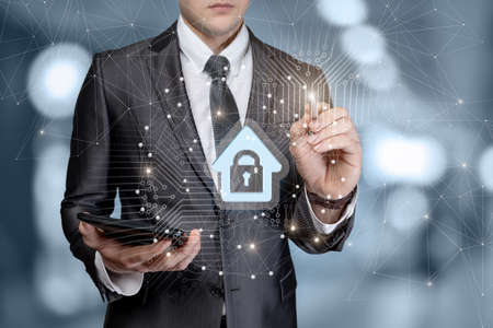 Businessman hand draw home insurance protection shield with safety network connecting icons. Property insurance security concept to protect family, real estate from accidents and unexpected disaster.
