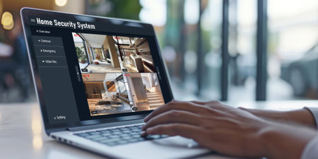 A homeowner monitoring their home's security cameras and alarm system from a central hub. Generative Ai