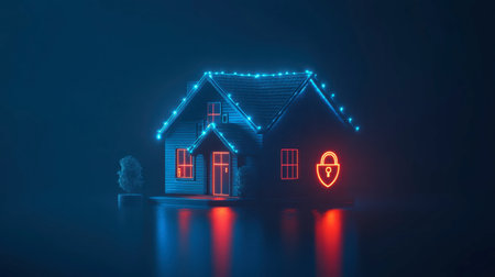 A glowing digital representation of a house with a lock symbol, highlighting the concept of home security and technological advancements in safety.