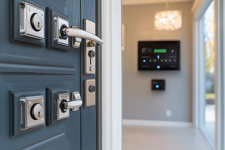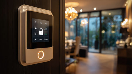 This image showcases a sleek smart lock control panel set in a stylish home interior, highlighting features of modern home security technology and design.