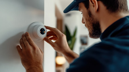 A cheerful middle-aged man stands outside his home, gazing at a smart home security camera. He shows satisfaction and confidence in his home security solution, feeling safe and protected.