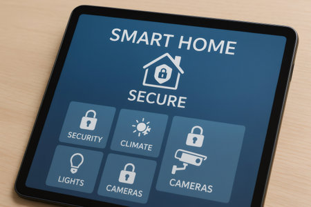 Modern home security system displayed on tablet in cozy living room. That the image is generated using AI.