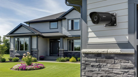 Security camera mounted on house wall for outdoor surveillance, background, AI generated