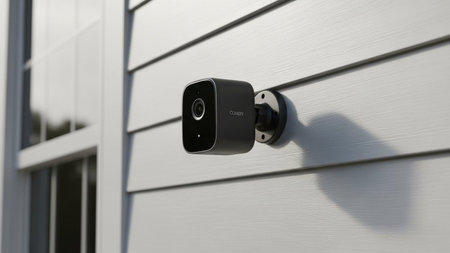 A black outdoor security camera is mounted on white clapboard siding, showing its modern and lens.