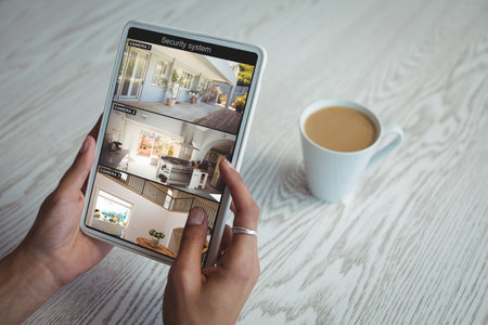 Controlling home with video cameras and digital tablet. Concept of remote video surveillance over the internet with smart touch screen devices