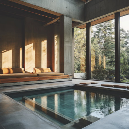 A hotel room with an indoor pool, in the center of which there is a sunken seating area, with a concrete floor and walls made from raw wood. The windows on one side look out onto nature, while behind it lies another building designed in the style of Tadao Ando, with a raw, receptive style of photography. --v 6.1 Job ID: 9448fca0-4a1f-42f4-bb5b-2ce5bf8d7706