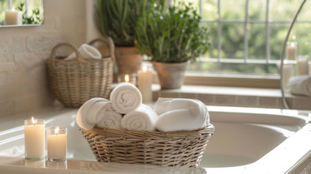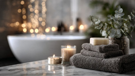 A serene bathroom setup with towels, candles, and a bathtub in the background