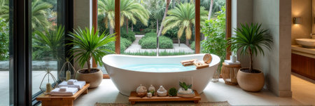 Luxurious spa bathroom with freestanding tub and tropical garden view. That the image is generated using AI.