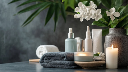 A spa setting with luxurious skincare products, candles, and soft towels arranged neatly